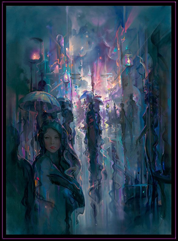 After admiring them I turned a corner and saw the kind of painting one rarely sees in a small Hawaiian town, although I later learned that the artist lives in Honolulu. The painting was called “Night Street” and the artist is John Pitre. He says it represents “A collage of my memories from New York, London, Tokyo, and Honolulu. The essence of the moods and the action on the street of any big city at night.”